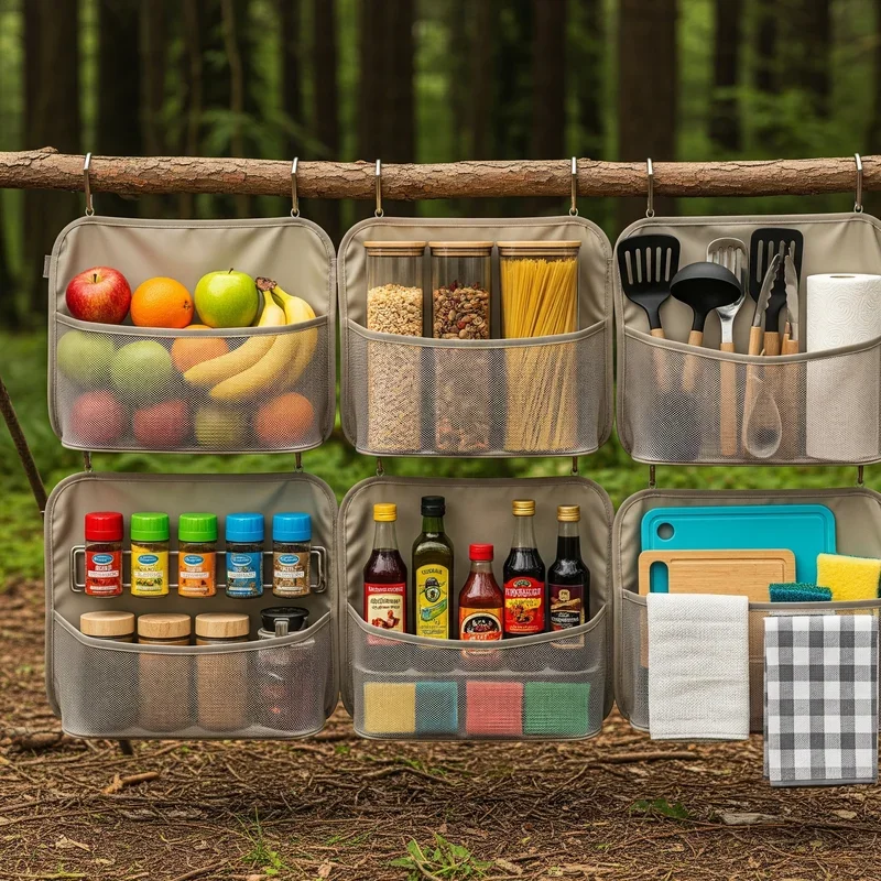 Vertical storage solves the eternal camping problem of limited table space. Hanging mesh organizers suspend from trees, canopy frames, or dedicated poles, creating instant pantries for your dry goods and cooking supplies. These lightweight organizers feature multiple compartments perfect for separating breakfast items from dinner ingredients. The mesh material allows airflow, preventing moisture buildup, and lets you see contents at a glance. Use carabiners for quick attachment and removal, making setup and breakdown effortless. Designate different organizers for different meal categories or assign one per day of your trip. This system keeps food off the ground, away from critters, and protects items from morning dew. Plus, having ingredients at eye level makes meal planning easier when you can see everything available.