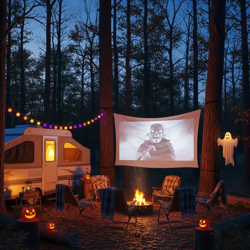 Create an unforgettable outdoor cinema experience with a Halloween movie marathon under the stars! Set up a portable projector and white sheet between two trees, or use an inflatable movie screen for a more professional setup. Arrange camping chairs, blankets, and sleeping bags in semicircle viewing formation. Choose films ranging from family-friendly options like "Hocus Pocus" to scarier selections for later hours. Don't forget a backup battery pack or generator for power. Enhance the experience with themed snacks: popcorn in orange and black containers, "bloody" red drinks, and candy corn trail mix. Use citronella candles in jack-o'-lantern holders to keep bugs away while adding ambiance. Create an intermission schedule for bathroom breaks and snack refills. Position speakers strategically for surround sound effects that'll make every creak and scream more impactful. Weather-proof your setup with tarps overhead just in case. This modern twist on camping entertainment brings the drive-in experience to your secluded spot.