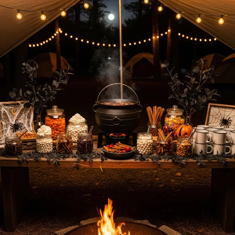 Conjure up a magical beverage station that warms bodies and spirits after chilly October adventures! Set up a camping table as your "potion station" with a large pot of hot chocolate kept warm over low coals or camping stove. Label ingredients with spooky names: marshmallows become "ghost clouds," whipped cream is "phantom foam," and cinnamon sticks are "witch's wands." Include unusual additions like pop rocks for "crackling magic," gummy worms for "swamp creatures," or candy eyes for "watching spirits." Offer flavored syrups in bottles labeled as potions. Create recipe cards for signature drinks like "Vampire's Delight" (add red food coloring) or "Werewolf's Howl" (extra chocolate). Use Halloween-themed cups or mason jars with decorative straws. Add dry ice to a separate container nearby for smoking effect (never in drinks). This interactive station becomes a social hub where campers create custom concoctions while sharing warmth and stories.