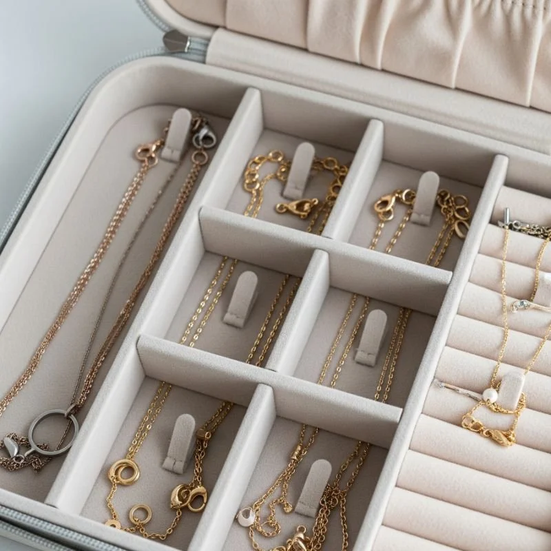 Now, if you're feeling fancy or travel frequently, investing in a proper jewelry travel case with individual necklace compartments is worth every penny. Look for ones with hooks or individual pouches—these are designed specifically to prevent the tangle disasters we're trying to avoid.