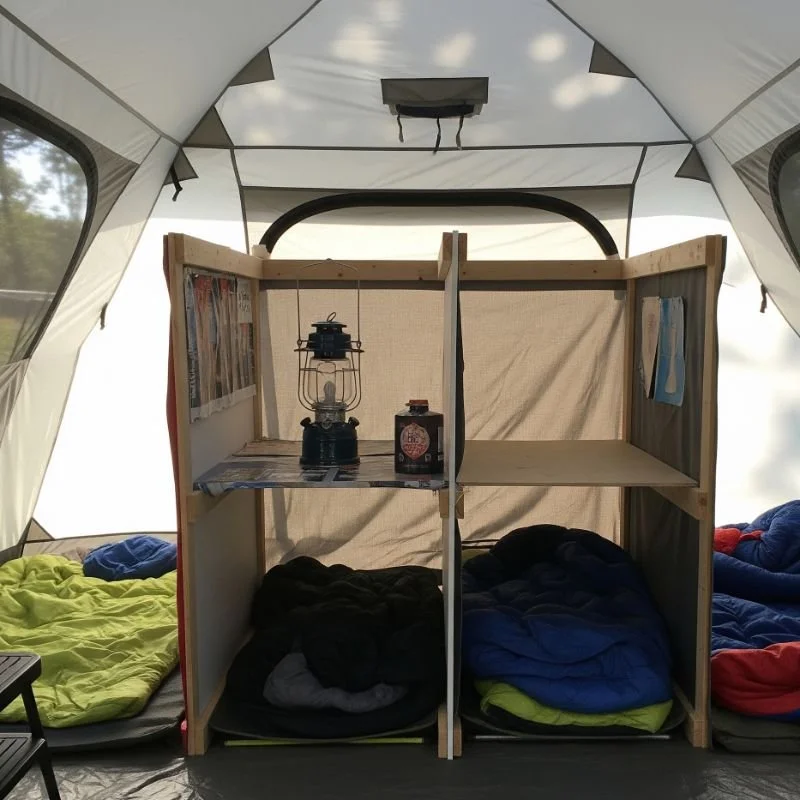 Transform a single tent space into multiple "rooms" using creative DIY dividers that provide privacy and organization without permanent modifications. Lightweight curtains hung from paracord, retractable clotheslines with sheets, or even strategically placed gear create distinct areas for sleeping, changing, and storage. This is especially valuable for family camping or sharing tents with friends. Use tension rods between tent poles for easy installation, or clip lightweight fabric to existing gear loops. The psychological benefit of defined spaces makes your tent feel larger and more organized. Kids get their own "fort," couples gain privacy, and everyone enjoys a more structured living environment. It's like having a studio apartment instead of just one big room, making longer camping trips much more comfortable.