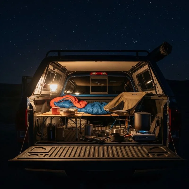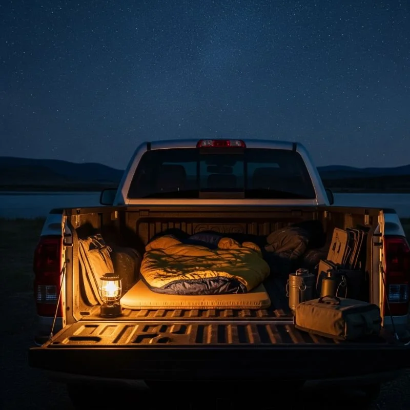 Bedding Setup: Layer your bedding just like you would at home. Start with a fitted sheet if your mattress accommodates one, then add your sleeping bag or blankets. Having familiar bedding can make your truck bed feel more like home.